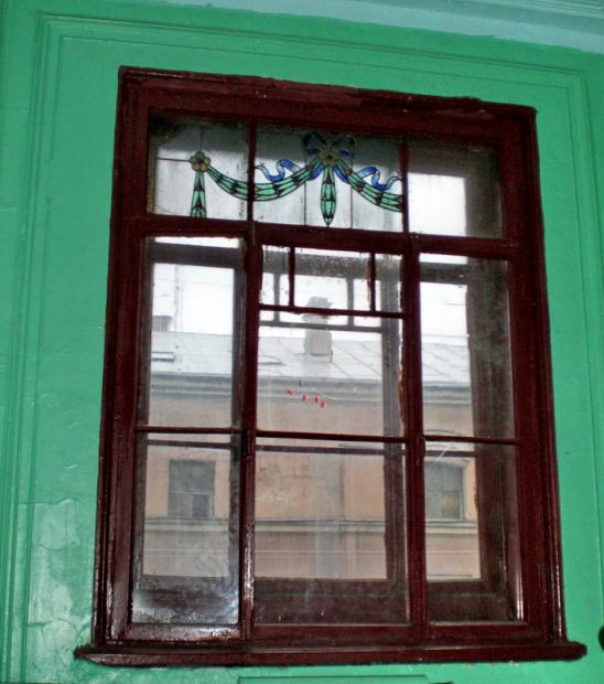 Дом и правда был некогда хорош весьма: на фотографиях это не особо заметно, но в ряду своих соседей по улице он очевидно выделяется и стилем, и монументальностью; впрочем, время обошлось с ним крайне безжалостно. От лепнины и чугунного литься на фасаде практически ничего не осталось, а уж изнутри изуродовали и изничтожили все, что можно практически все квартиры в доме были – а многие до сих пор остаются – коммунальными. Фрагмент витража, например, уцелел только в двух отделениях одного из огромных окон на нашей лестнице – и я помню, какое завораживающее впечатление своей неуместностью, нездешностью, несоответствием окружающему бардаку и бедламу этот кусочек старой жизни производил на меня маленькую, когда мы только-только туда переехали. Тогда еще стены в подъезде были охристо-розовыми, это уже после моего переезда их выкрасили совсем уж несуразным и диким в сочетании с черно-коричневой окраской рам и перил изумрудно-зеленым колером. Уцелевшие же элементы фасадного декора, все эти портики, пилястры, эркеры-балконы, фризы-молдинги-карнизы – как-то совершенно обветшали и потерялись на фоне общей разрухи.